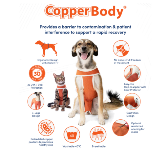 Laget av et kobber-impregnert stoff. Gir en fysisk barriere mot slikking og forurensning, reduserer bakterievekst og lukt. Beskytter pels og hud mot flått/parasitter, friksjon og smuss. Ergonomisk designet med stretch-passform og finnes i flere størrelser. Beskytter mot solen (30 UVA- og UVB-beskyttelse)